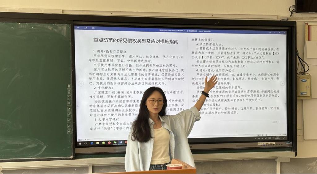 会议着重提出,图片、字体与音乐作品是学院媒体创作过程中侵权现象频发的三大领域。例如,随意从网络上下载图片、使用来源不明的表情包,或是使用未获得授权的字体,都可能构成著作权侵权;而音乐作品由于涉及词曲作者、表演者以及录音制作者的多重权利,若在视频制作中未经授权使用背景音乐,同样会面临法律风险。此外,会议特别强调,在转载公众号文章时,必须核实版权归属,避免因“二次传播”而引发纠纷。