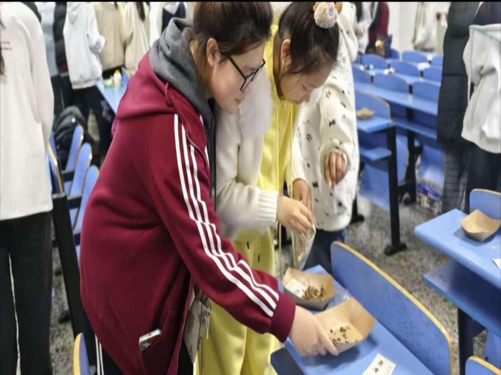 学习结束后,同学们满怀期待地投入到创作中。大家精心挑选了自己心仪的香囊空袋,依据个人喜好搭配香料,打造出独一无二的专属香气。在装填香料时,每个人都显得小心翼翼;系挂饰时,更是认真细致,全神贯注。每个人都沉浸在手工制作的乐趣之中。现场氛围既热烈又温馨,同学们相互交流搭配心得,分享装饰创意。遇到问题时,大家主动向学生组织人员请教,现场不时传来阵阵欢声笑语。