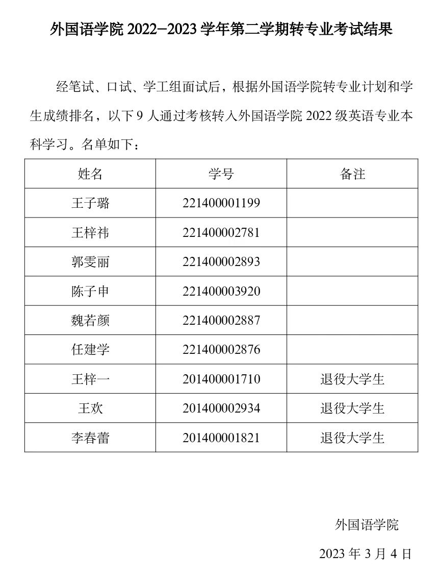 taptap点点体育2022-2023学年第二学期转专业考试结果