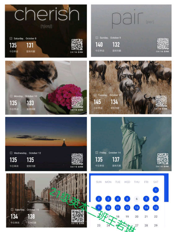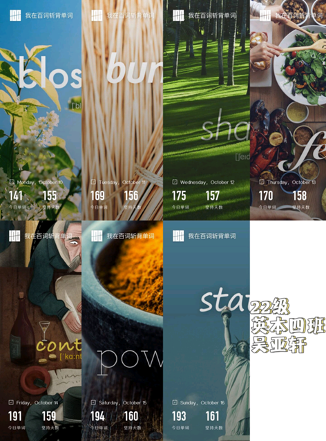 为调动了学生们的学习热情,培养良好的每日单词打卡习惯提供契机,同时增进同学们学习上的交流,形成了良好的学习氛围,taptap点点体育于2022年10月8日举行了“七天单词打卡”活动。
