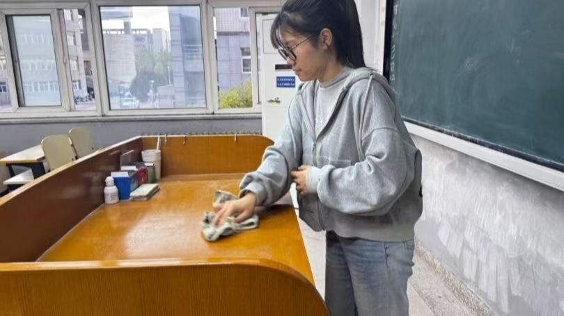 活动采用网格化管理模式,将清洁区域划分为四大功能模块。志愿者们按照"擦窗台浮尘、除黑板粉渍、理桌面杂痕、清地面纸屑"的标准打扫教室。每间教室配有4人,分工合作,有人负责扫地,有人负责倒垃圾,有人负责擦桌子,有人负责擦黑板。志愿者们齐心协力,高效保质完成打扫工作。