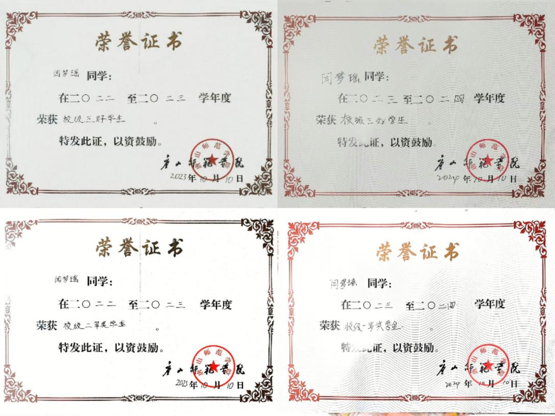 闫梦瑶在学业上成绩斐然。连续两年,她都被评为校级三好学生国家励志奖学金以及校级一等、二等奖学金也纷纷收入囊中。在各类专业考试中,她更是表现出色,计算机二级、英语四六级均高分通过,普通话达到一级乙等水平,还顺利取得专四证书,这些成绩充分彰显了她扎实的专业实力。在各级各类竞赛中,她同样屡获佳绩,荣获省级奖2项、校级奖项10余项。