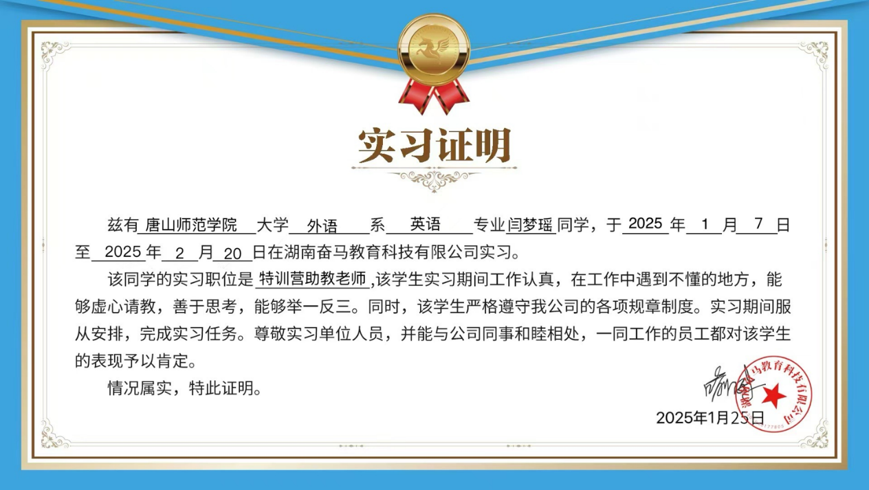 在实习实践方面,闫梦瑶积累了丰富的经验。她曾在北京小小道元、唐人优学、奋马职前教育等企业实习,在不同的岗位上发光发热。担任英语助教时,她助力青少年成长;成为督导后,她不断打磨自身职业素养,赢得了家长们的认可。在大学生职前教育领域,她以知心学姐的身份,为上百位大学生解答困惑,收获无数封感谢信。企业导师的赞誉、家长的肯定以及学弟学妹的认可,见证了她从校园学子到职场精英的华丽蜕变。