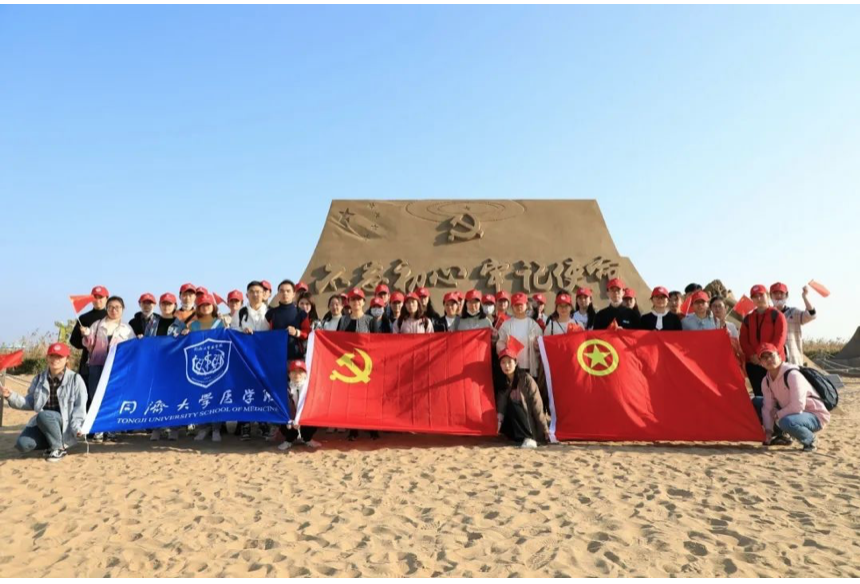 车轮转动,一路前行,同医青年来到位于金山城市沙滩的最后一站——“四史”学习教育主题沙雕展。这里汇集了52座沙雕,以时间为轴,充分挖掘“四史”中的重大事件和伟大成就,创作了不同主题的“四史”沙雕作品,从多个层面、多个维度全面展现了“四史”的宏观和微观。在一座座精美的沙雕前,青年们驻足而立,细细品读历史,追忆革命故事,重温入党誓词,时刻不忘对党的承诺。