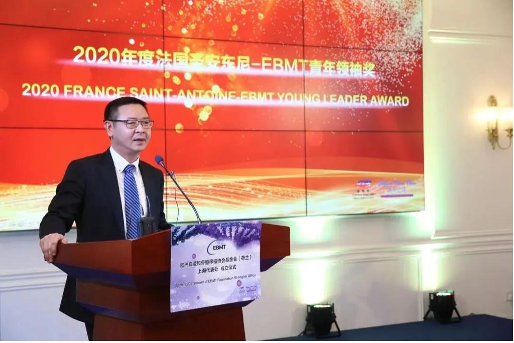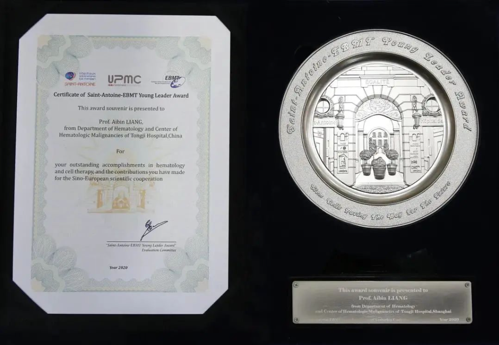 12月15日,欧洲血液和骨髓移植学会(EBMT)基金会上海代表处成立仪式举行。会上,awc777万象城娱乐官网附属同济医院副院长、血液肿瘤中心主任梁爱斌教授凭借在血液肿瘤疾病治疗方面的成功实践,获颁欧洲血液和骨髓移植学会基金会“圣安东尼-EBMT青年领袖奖”。